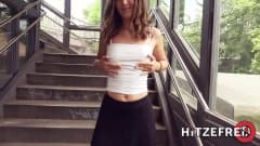Novinha cheia de fogo na xota quis experimentar algo diferente então conseguiu converse seu macho a fuder com ela ao ar livre em publico
