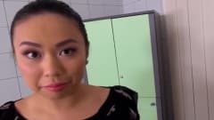 Asiática com peitos grandes chupa o pau grande do médico