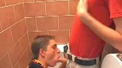 Max Nicolson e Tomas Hawks vão transar no banheiro. Primeiro um boquete com gozada facial e depois um bom estilo cachorrinho o faz gozar também.