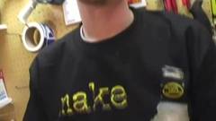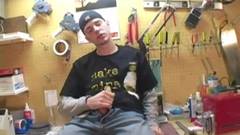 Esse faz-tudo está em sua garagem, tira o pênis da calça jeans folgada e começa a se masturbar sensualmente.