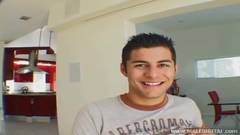 Um latino com um belo abdômen e uma tatuagem sexy se masturba na sala de estar. Ele não é a cereja do bolo?