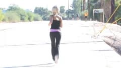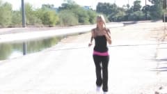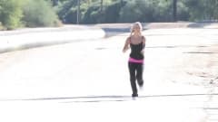 Essa loira é muito safada e, quando sai para correr, tira algumas de suas roupas para mostrar seu belo par de peitos a todos que passam por ela.