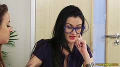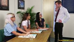 Esse cara participa de uma entrevista de emprego na qual os recrutadores são três prostitutas muito sexy e ousadas que acabam chupando seu pau.