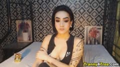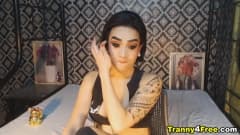 Uma asiática sexy nos deslumbra com seus lindos seios e tatuagens, masturbando seu grande pau na frente da câmera.