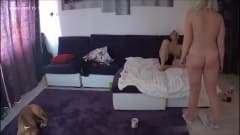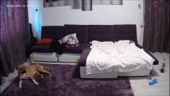 Um jovem casal amador fazendo um reality show onde eles compartilham tudo através de uma câmera na sala de estar com seu animal de estimação.
