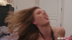 Novinha loira magrinha paga um boquete com direito a garganta profunda bem gostoso para depois sentar bem fundo na grande pica do padrinho