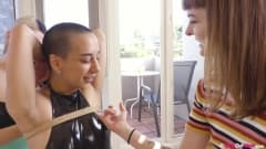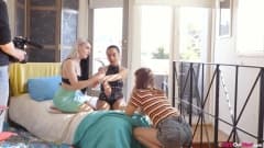 Modelos pornô lésbicas excitadas pedem a uma garota de sua equipe para se juntar a elas e ajudá-la a se amarrar à sua parceira