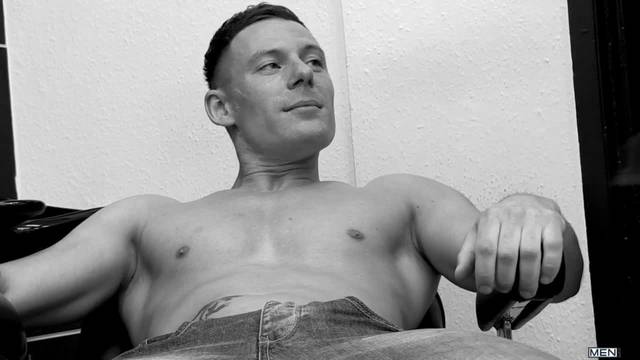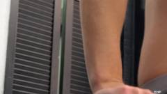 Dois caras estão no banheiro e um deles abre o zíper da calça jeans e tira o pênis para o outro começar a chupá-lo!