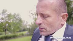 Novinha loira sexy pagando um boquete fora da escola ao ar livre para o professor velho pervertido não deixar ela de recuperação.