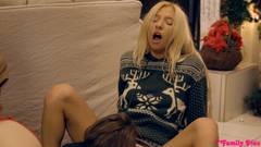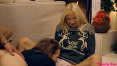 Essas duas safadas não esperam o Papai Noel foder a irmã atrás do sofá onde seus pais estão sentados.