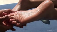 Novinha paga para um macho fazer uma massagem bem gostosa ao ar livre com ela nuazinha cheia de oleo pelo seu corpo todo