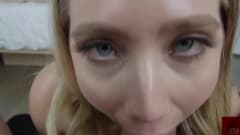 Este vídeo mostra uma estrela pornô loira e sexy com peitos pequenos e bonitos - AJ Applegate - chupando um pau em POV e recebendo uma gozada facial
