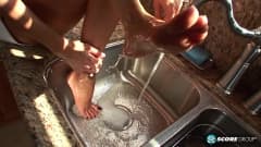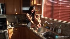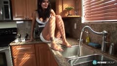 Essa morena fofa começa a tocar os pés no balcão da cozinha, fica com tesão e acaba se masturbando na frente da câmera.