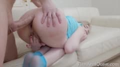 Liza Smoke, uma loira russa com belas curvas em sua bunda, recebe sua primeira foda anal no sofá e uma creampie para terminar recheada.