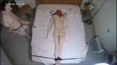 Ele a amarrou na cama e começou a chicotear seu corpo, tendo prazer em sua dor e depois começou a fodê-la.