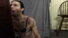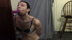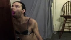 Esse cara de cueca feminina é filmado enquanto chupa um vibrador preso na parede. Este idiota gostaria que este animal não fosse feito de borracha.