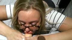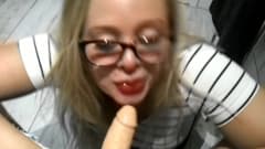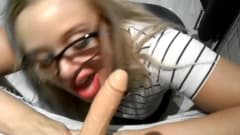Uma loira de óculos mostra um boquete em seu vibrador em POV. Ela é muito convincente e todo mundo sonha com ela chupando um pau assim.