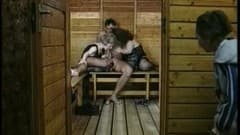 Numa sauna, um homem recebe a visita de duas anãs maduras em lingerie sexy pra ele se despir e deixar chupar seu pau!