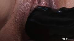 A bela atriz pornô loira vai se divertir sozinha com um grande vibrador preto em forma de pênis que ela leva para o fundo de sua buceta excitada