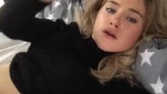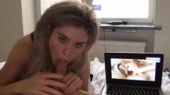 Essa loira assiste pornô no laptop e fica com muito tesão e super molhada. Use um vibrador para gozar até que o namorado entre e melhore
