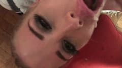 Essa loira se diverte muito enquanto chupa o pau dele e depois fica com o rosto coberto de porra.