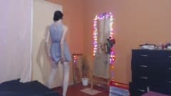A morena começa sua dança sensual e vai se despindo lentamente. Completamente nua, ela se masturba com brinquedos sexuais e goza com força.