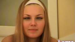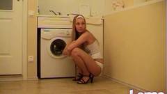 Uma máquina de lavar, uma jato de agua quente, o cabo duma faca de cozinha e muito, muito tesão! São os ingredientes desta loira tesuda para uma boa sessão de masturbação de improviso.