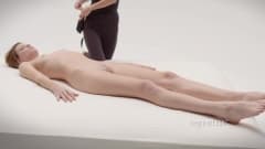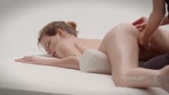 Novinha magrinha recebe uma massagem muitoo intensa e sexy por uma massagista que a masturba e ainda soca na buseta dedadas profunda