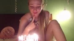 Essa jovem passa o aniversário sozinha, mas não está entediada. Ele fica feliz em se masturbar e comer um bolo, que ele compartilha com seu cachorro.