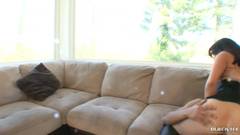 Uma linda morena com peitos e bunda grandes adora chupar o pau enorme do namorado. Ela mal pode esperar para pular em cima dele e ser fodida!