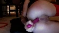 Em sua meia-calça vermelha, ela enfia um vibrador em sua boceta