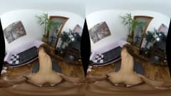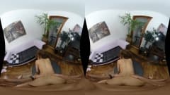 A morena cavalga em uma vaqueira invertida em um vídeo de realidade virtual. Ela também chupa um pau em POV.