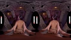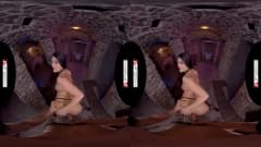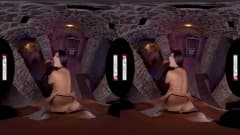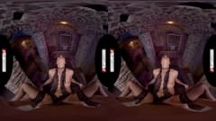 A linda morena em um cosplay sexy de meias pretas tem uma buceta peluda para penetrar nesta cena de realidade virtual!
