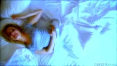 Loira deitada na cama e sonhando com um orgasmo