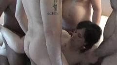 Esta vagabunda está em um gangbang, super excitada pegando tantos paus quanto possível. Ela chupa vários, tem dupla penetração e no final leva um bukkake!