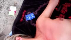 Ao se despir sobre essas toalhas, no meio das dunas de areia, ela espera que esse homem faça sexo com ela e a deixe chupar seu pênis ao ar livre.