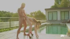 Uma morena magra e muito bonita com peitos pequenos é fodida por trás como uma cadela na piscina. Ela está usando saltos muito altos.