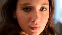 Essa linda morena tem o melhor momento enquanto chupa o pinto desse cara e depois fica com a cara cheia de porra