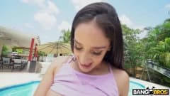 Brunette Sheena Ryder está ansiosa para chupar o grande galo de um jovem negro que ela conheceu na piscina. No sol escaldante, o cara vai gozar na sua boca