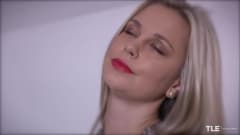 Uma loira atraente em lingerie sexy e meias e cinta liga vai se masturbar de forma sexy com a ajuda de um grande brinquedo sexual!