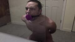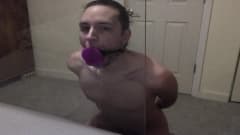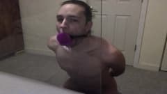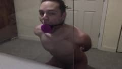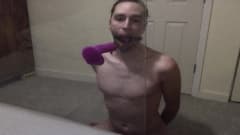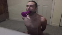 Jovem gay pratica garganta profunda em brinquedo sexual