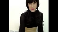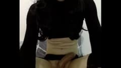 Essa travesti sexy, toda de roupa preta e meias de liga, senta na frente da câmera e masturba seu pau. Essa morena é muito gostosa!