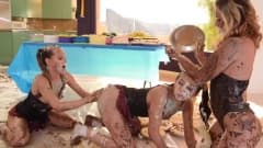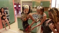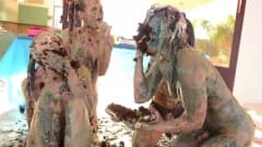 Jillian, Melissa e Sasha apreciam comida e bolos lambendo diretamente de seus corpos. Elas fazem uma bagunça na cozinha.