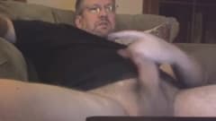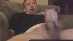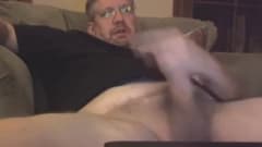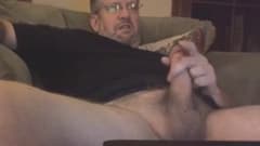 Um cara grande e maduro com óculos masturba seu grande galo e jorra profusamente na barriga, excitando!
