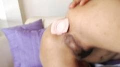 A travesti asiática, fica muito sexy em sua roupa de empregada que revela sua buceta operada cirurgicamente e seu cuzinho apertado com um plug anal.