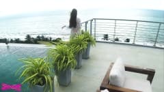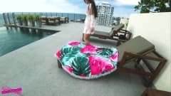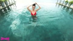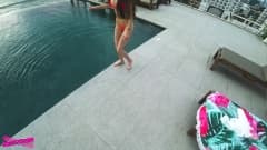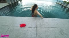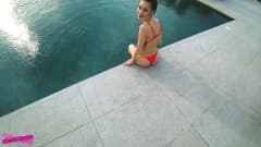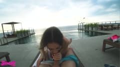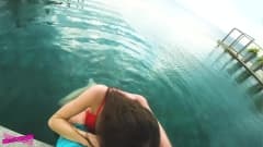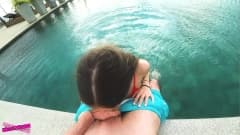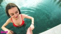 Garota bonita toma um banho na piscina e chupa o pinto do namorado