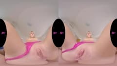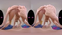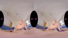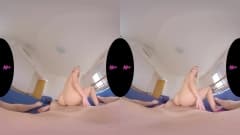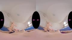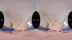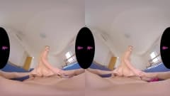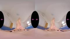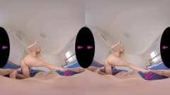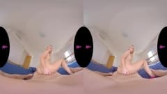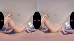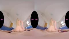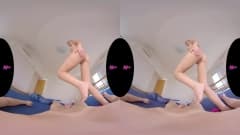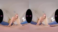 Jovem, bonita, loira, puta grande e magra com peitos pequenos fode em realidade virtual esperando por um Pov dick.