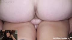 Morena tatuada quente com tetas grandes é fodida em gang bang
