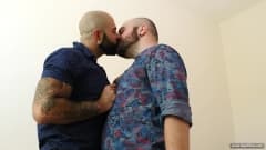 Dois caras gays maduros, peludos, tatuados e sexy ficam excitadosse se acariciando, chupando e lambendo um ao outro antes do sexo anal intenso. Que tesão!