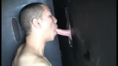 Jovem loiro sendo sugado por um garoto asiático no Gloryhole